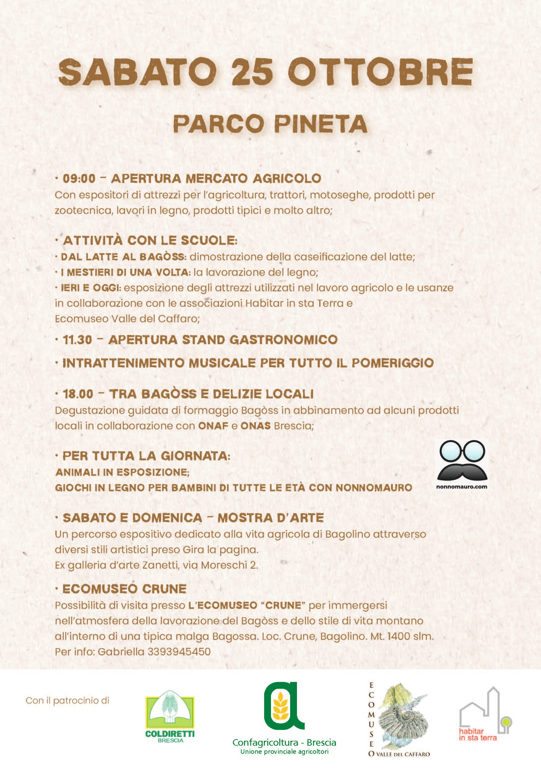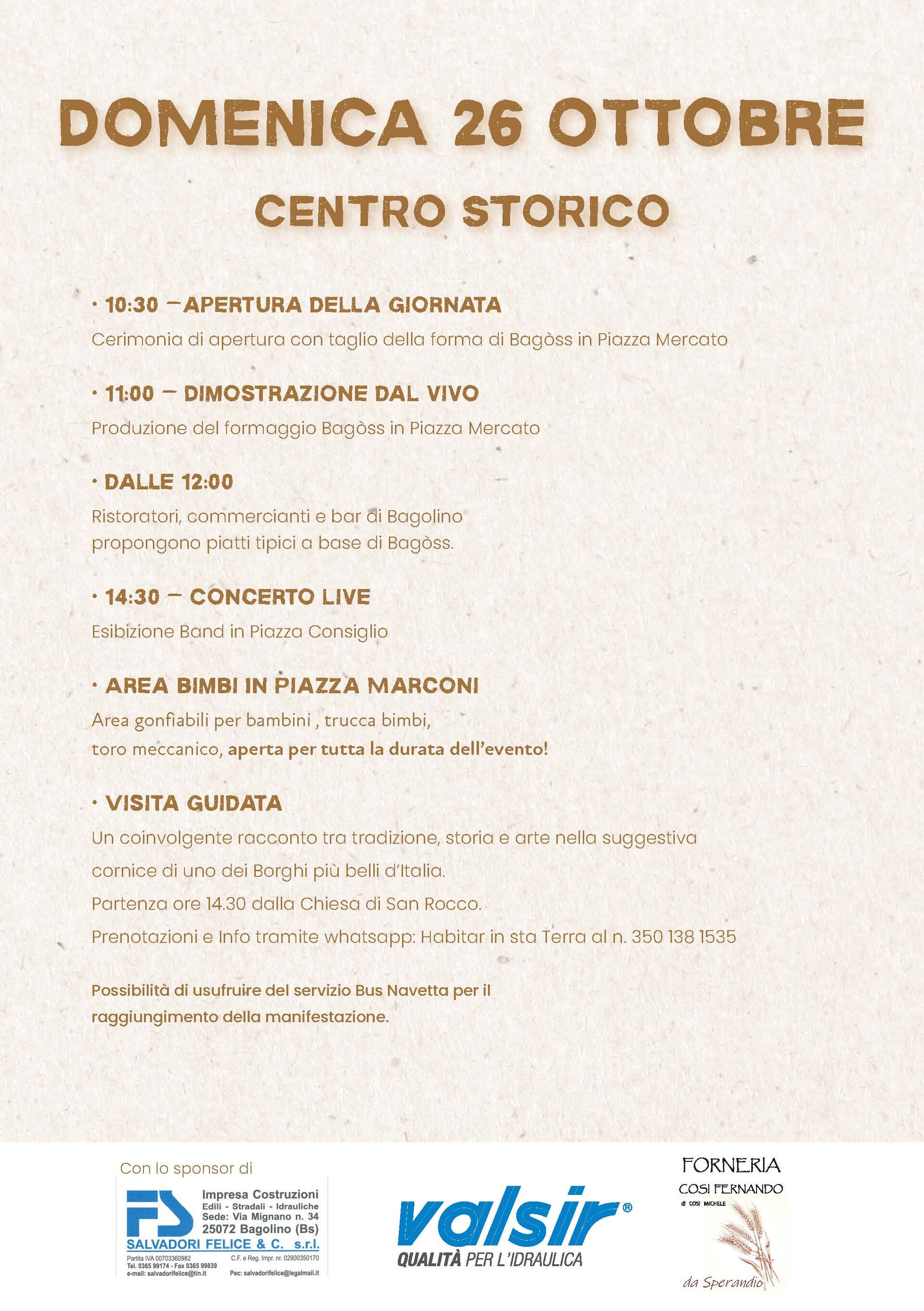 Bagolino, il 25 e il 26 ottobre , vedrà protagonista il suo formaggio tipico: il Bagòss. Due giornate durante le quali si susseguiranno dimostrazioni della lavorazione del latte, esposizioni di animali, giochi in legno per bambini, degustazioni guidate e piatti tipici locali.