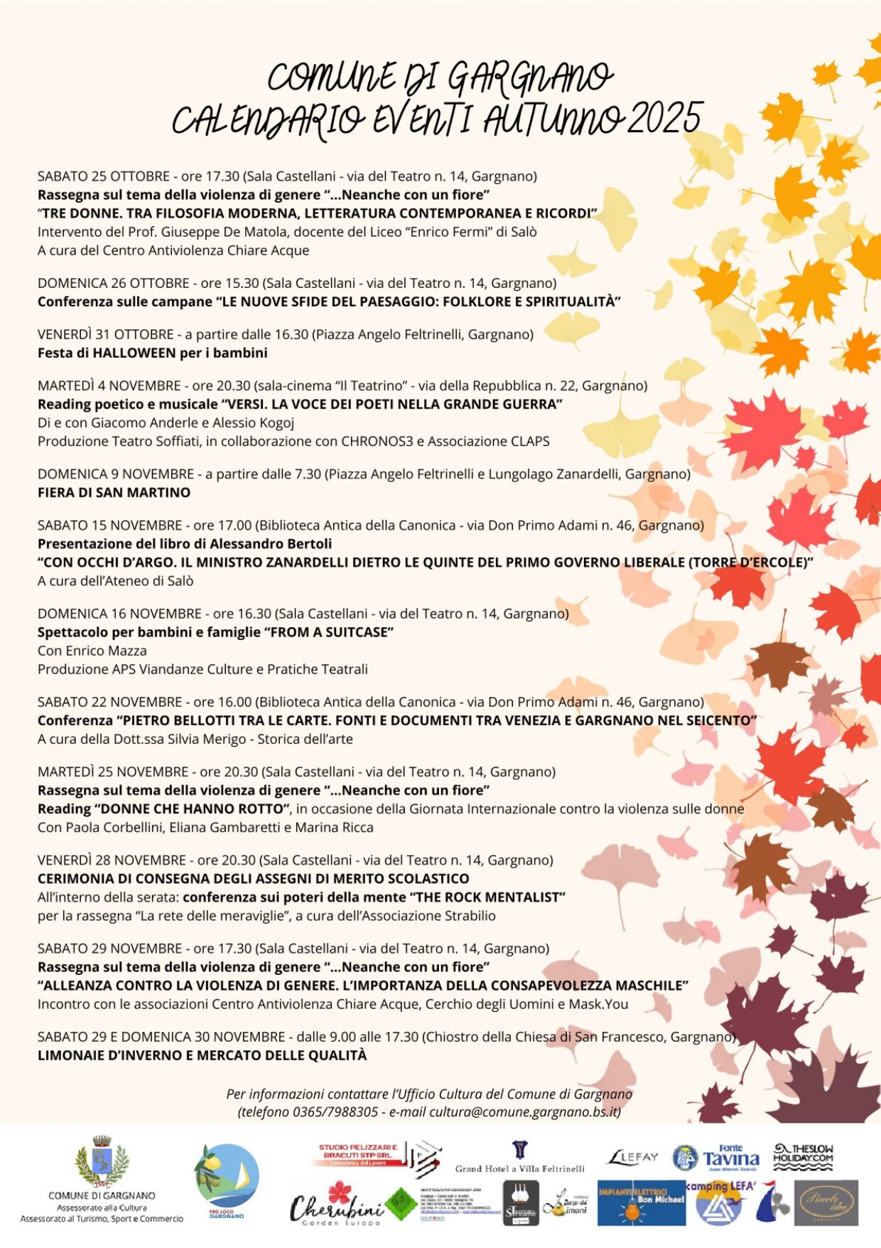 Da fine Ottobre e per tutto il mese di Novembre, a Gargnano vi aspettano numerosi eventi. Si parte dalla cultura, con conferenze e presentazioni di libri, ma non mancheranno spettacoli per bambini, feste di halloween, fiere e le suggestive limonaie d'inverno!