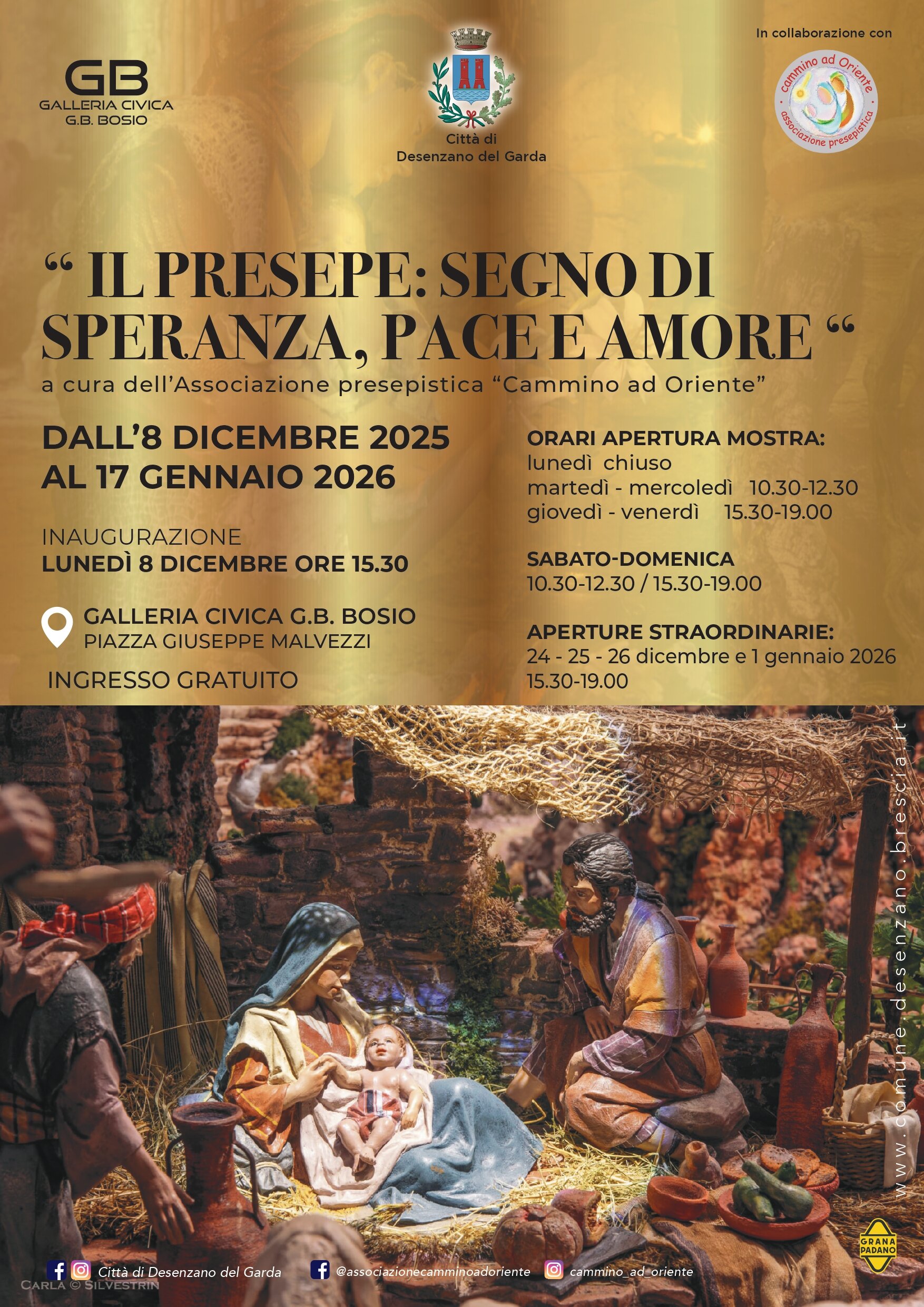 Dall'8 dicembre al 17 gennaio vi aspetta "Il Presepe: segno di speranza, pace e amore" a cura dell'Associazione presepistica "Cammino ad Oriente" presso la Galleria Civica G.B. Bosio, Piazza Giuseppe Malvezzi, a Desenzano del Garda.